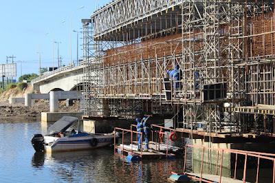 Em ritmo acelerado, a obra continua em fase de cimbramento, com a armação e forma das vigas de sustentação da nova faixa da ponte, no sentido Centro/Praias. Nos próximos dias, será passado o concreto deste lado, e montado o cimbramento do sentido contrário.